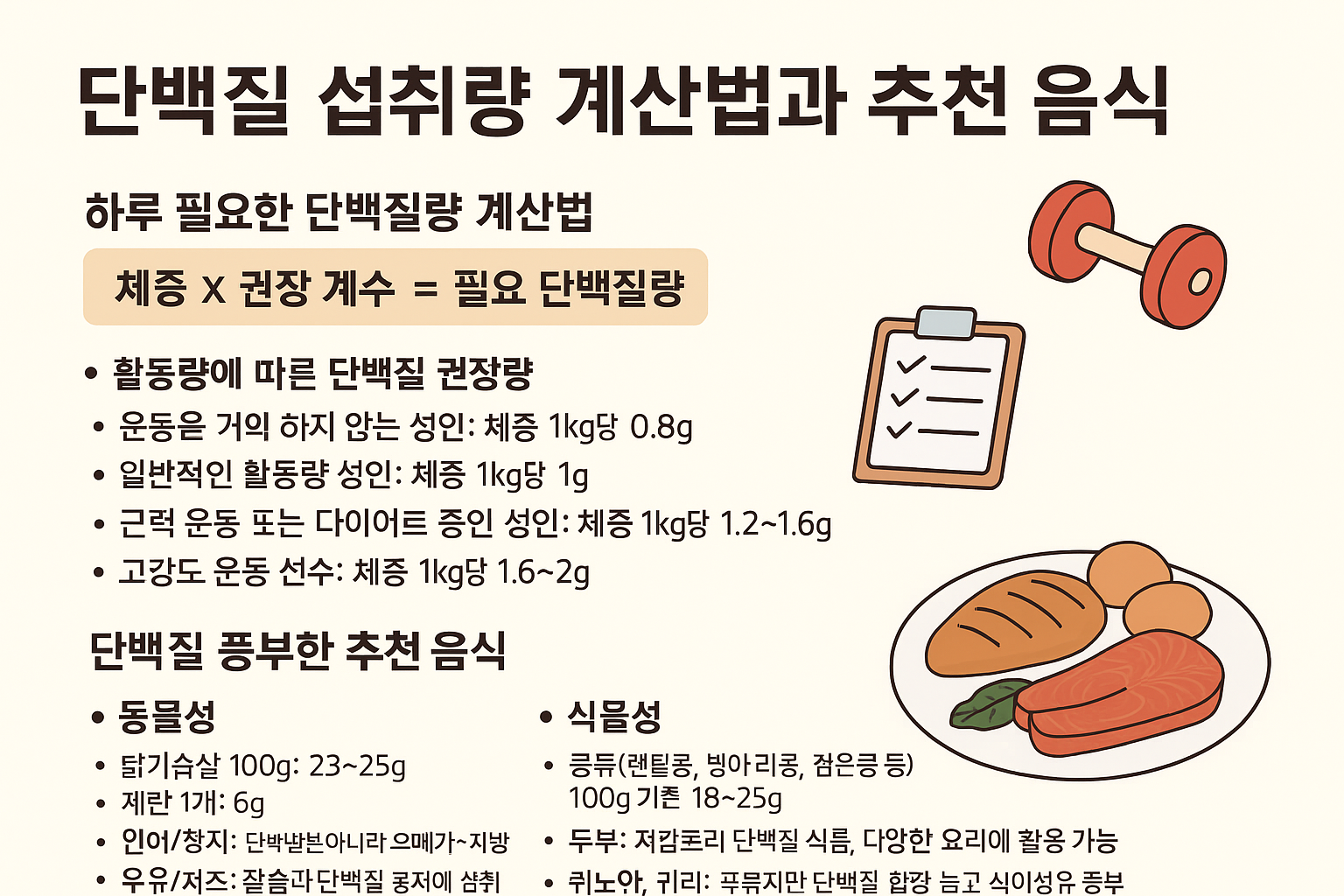 - 체중 × 활동량 계수로 하루 단백질 필요량을 계산합니다.