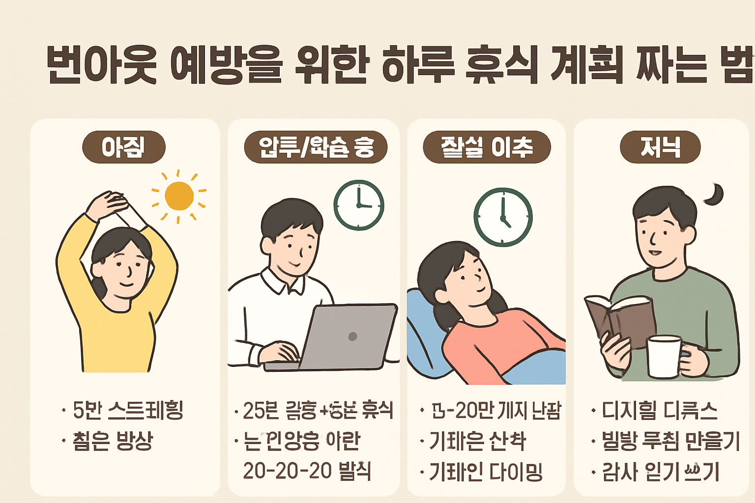 👉 저녁 휴식은 ‘심리적 안정’을 중심으로 잡아야 번아웃을 예방하는 효과가 극대화됩니다.