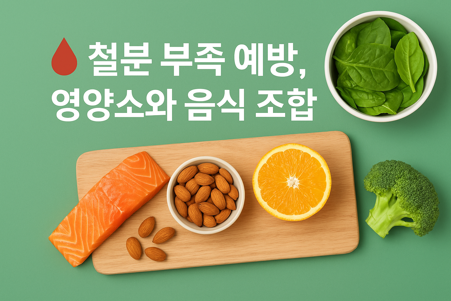 | 식물성 철분 섭취 | 시금치 + 오렌지, 브로콜리 | 시금치 + 커피, 홍차 |