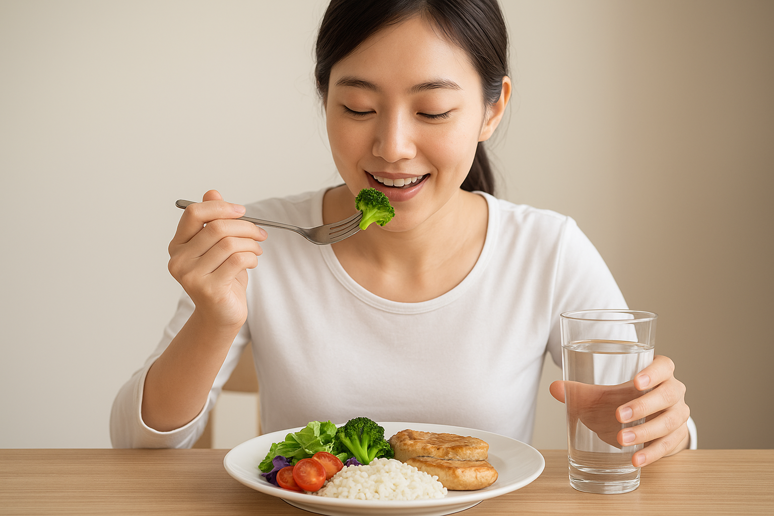 식사 속도는 폭식과 깊은 관련이 있습니다. 뇌가 “배부르다”는 신호를 받는 데는 약 20분이 걸리는데, 음식을 빨리 먹으면 이미 많이 먹은 뒤에야 포만감을 느끼게 됩니다. 따라서 한 숟가락 먹고 10~15번 이상 꼭꼭 씹는 습관을 들이면, 적은 양으로도 충분히 만족할 수 있습니다. 실제로 식사 속도를 절반으로 줄이는 것만으로도 하루 섭취 칼로리가 크게 감소합니다.